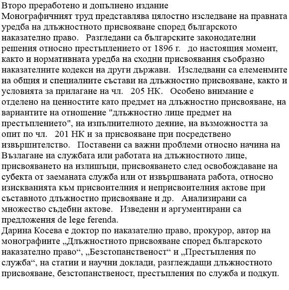 Длъжностното присвояване според българското наказателно право - второ преработено и допълнено изданиеАвтор: Дарина Косева