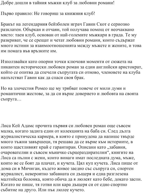 Тайният мъжки клуб за любовни романиАвтор: Лиса Кей Адамс